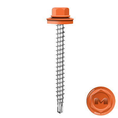 Кровельные саморезы Daxmer (Даксмер) по дереву цветом RAL2010 Оранжевый 4,8*50мм окрашиваются УФ-стойкой полиэфирной порошковой краской. Цинковое антикоррозийное покрытие обеспечивает длительный срок службы саморезов (не менее 25 лет). Специальная металлическая шайба с ЕРDМ - уплотнителем обеспечивает плотное прилегание профилированного металла (кровли) к деревянной обрешетке, а также препятствует попаданию влаги.